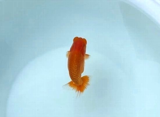 強烈な龍頭、朱赤で大型の長手体形。目先と目幅あり筒も太く迫力ある魚です。尾形良く泳ぎも安定しています。